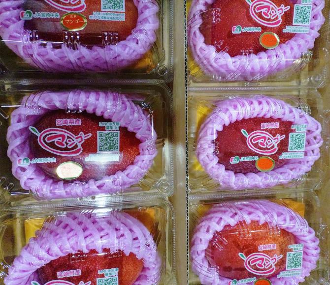 マンゴーは収穫適期の判定がとても難しいフルーツ。早採りすると糖度が低くなってしまうし、逆に完熟するまで置いておくと、地面に落下して商品価値がなくなってしまいます。そこで、ある程度大きくなったマンゴーの身にやわらかなネットをかぶせた後、ひもで釣り上げます。やがて、完熟して落ちた果実をネットでやさしくキャッチ‼この方法によって、宮崎完熟マンゴーがうまれました。栽培地も宮崎市、日南市など、県内10カ所に拡大しています!!